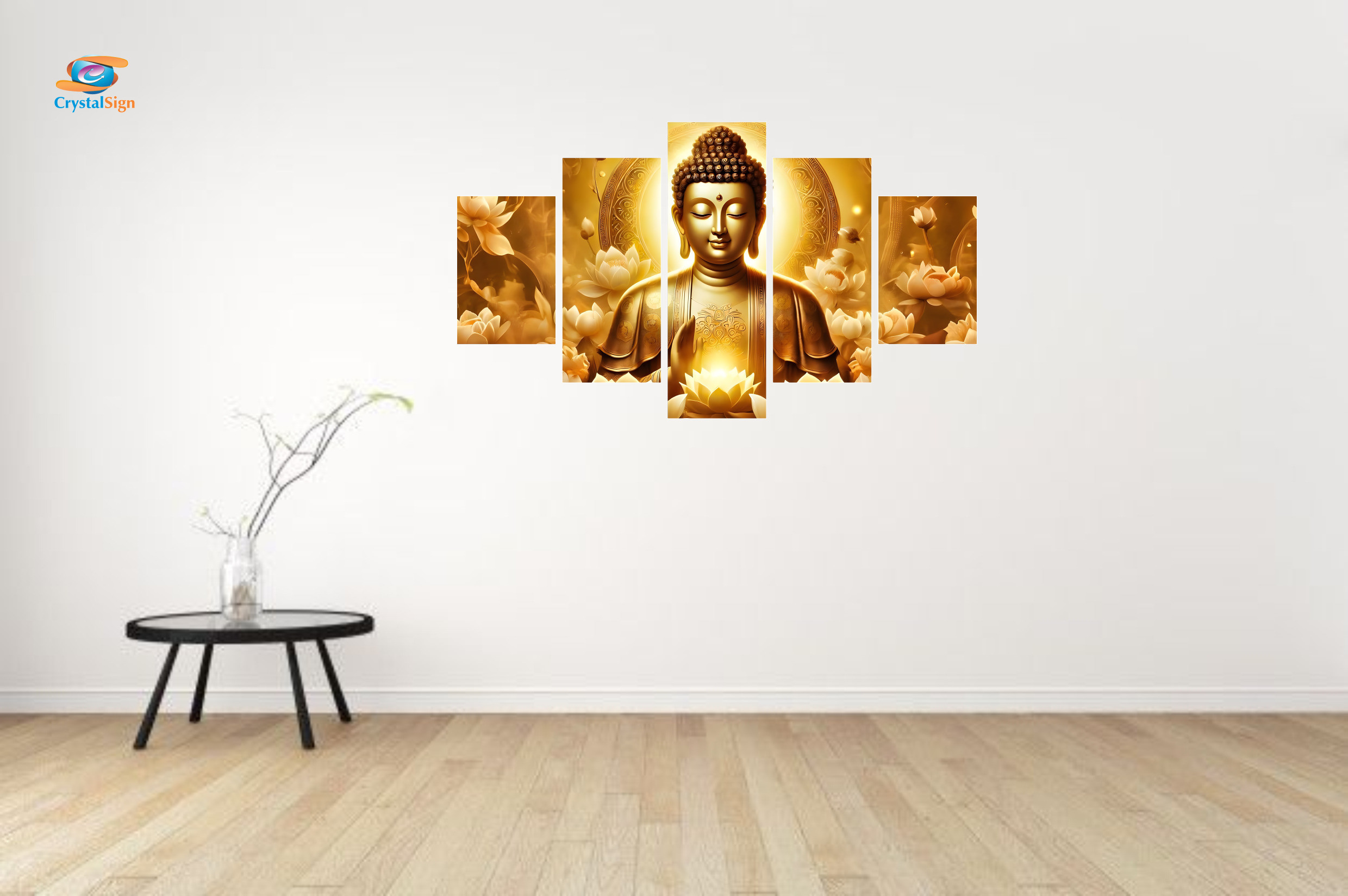 Enhanced by CrystalSigns signature crystal-clear printing technology, every element of this masterpiece shines with unparalleled brilliance. The soothing golden palette creates a warm, inviting ambiance, perfect for meditation spaces, living rooms, or work environments where calm and positivity are desired.