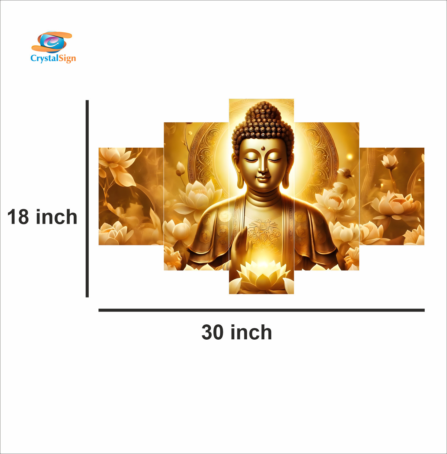 Bring home an aura of peace, enlightenment, and spiritual grace with CrystalSigns “Divine Serenity” five-piece wall art. Crafted with exquisite attention to detail, this radiant composition features Lord Buddha in a golden glow, surrounded by blossoming lotuses the eternal symbol of purity and enlightenment.