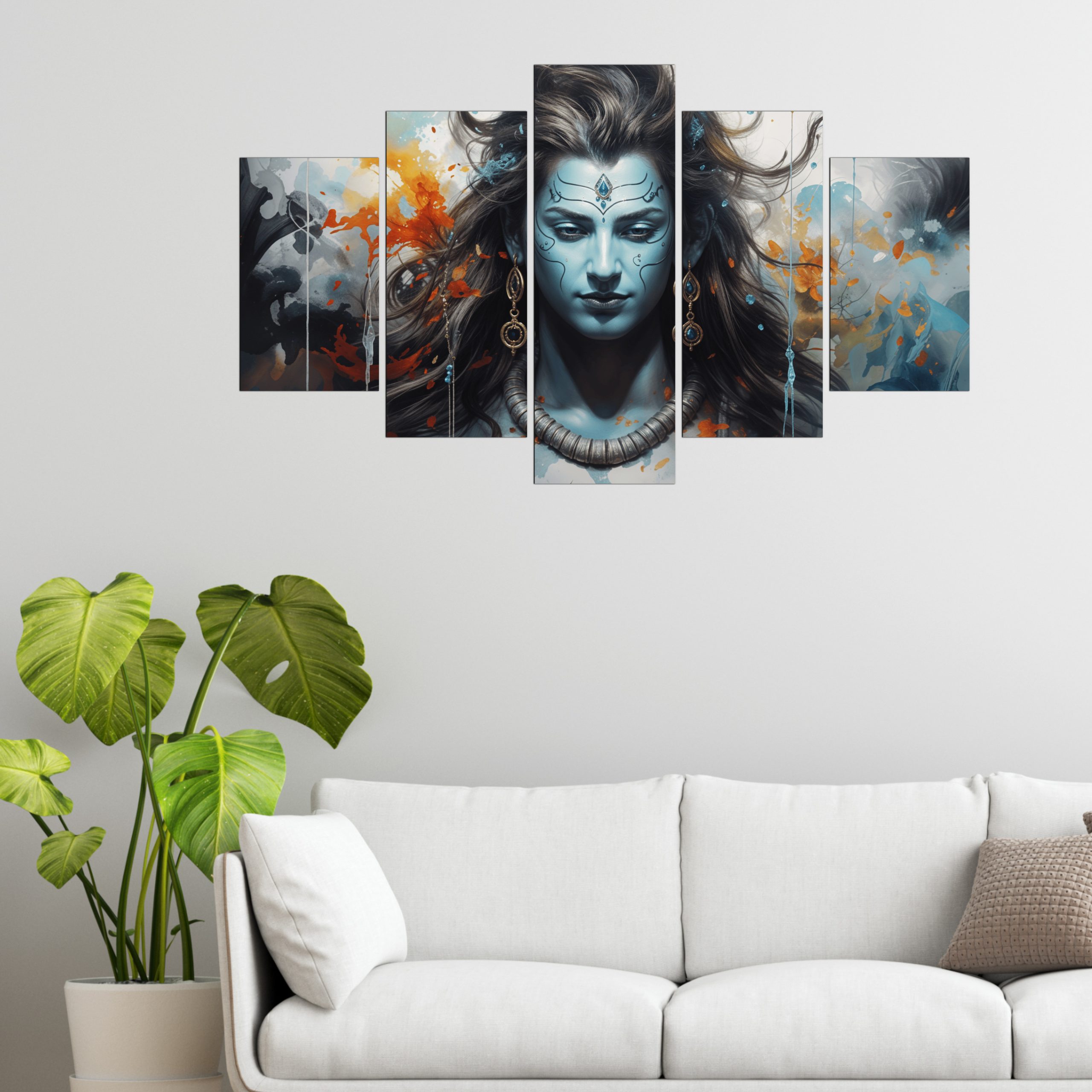 This beautiful 5 piece art will bring the serenity of Lord Saiva playing the flute right into your living room, bedroom or meditation area The vibrant blues and detailed floral accents make it the perfect piece for a peaceful and uplifting area The artwork is made from high quality material for colour and durability It easy to hang and maintain and is an excellent addition to any home or office décor If you are looking for a gift or just need a little uplift for your home